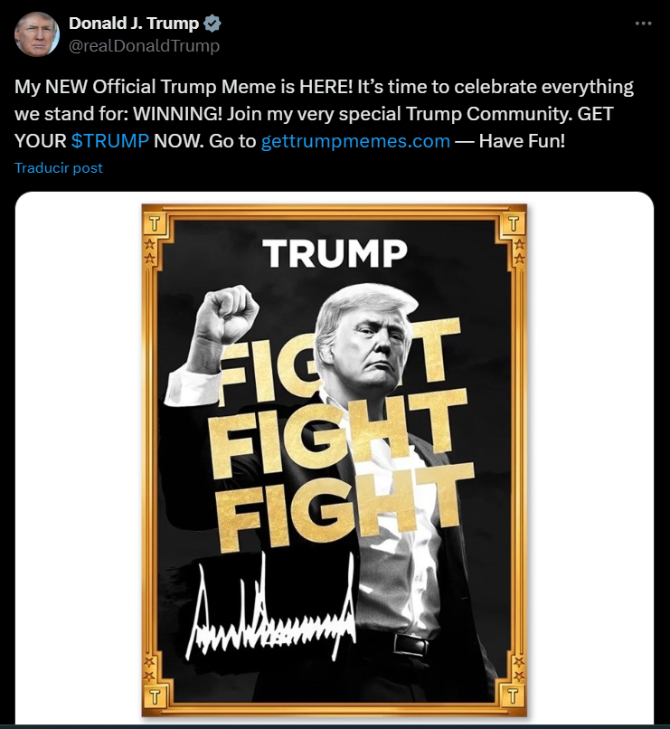 El 18 de enero de 2025, Donald Trump anunció a través de sus cuentas oficiales en Truth Social y X el lanzamiento de su memecoin «OFFICIAL TRUMP» ($TRUMP) en la blockchain Solana.
