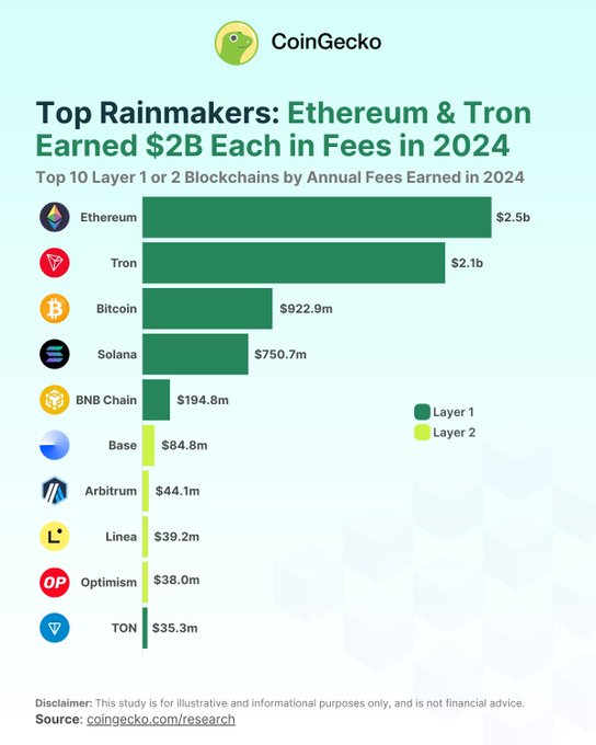 Según el informe de CoinGecko, el año 2024 marcó un hito en el mundo de los activos digitales, con las blockchains generando colectivamente U$S 6.900 millones en tarifas. Ethereum encabezó la lista con U$S 2.48 mil millones en ingresos por tarifas, representando un incremento anual del 3.0%.