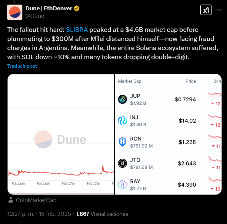 El caso ha reavivado el debate sobre la necesidad de una mayor regulación en el mercado de criptomonedas. Expertos argumentan que la promoción irresponsable de activos sin un respaldo claro puede conducir a fraudes y a pérdidas millonarias. Una de las víçtimas de ellos es el ecosistema de Solana que en todo su conjunto perdió en un par de días cerca del 10% de su valor del viernes 14 de febrero.