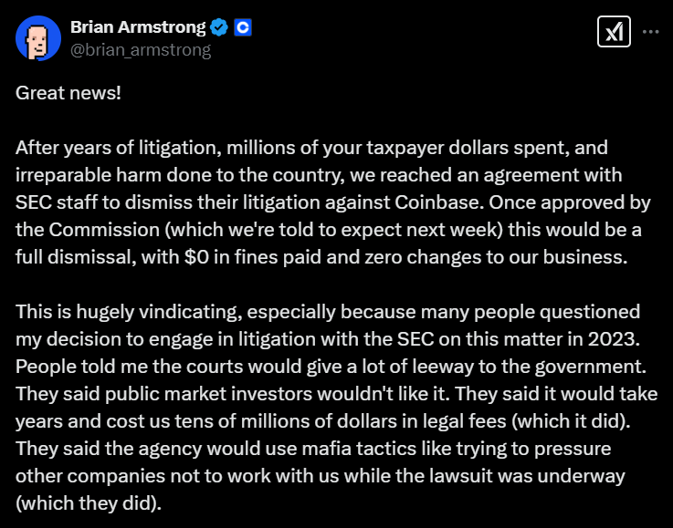 La lucha legal entre la Comisión de Bolsa y Valores de Estados Unidos (SEC) y Coinbase podría estar llegando a su fin. Según analistas del sector, el 20 de febrero de 2025, la SEC se encuentra a punto de retirar la demanda contra el gigante de intercambio de criptomonedas, lo que se considera “un gran momento para el cripto en EE.UU.”
